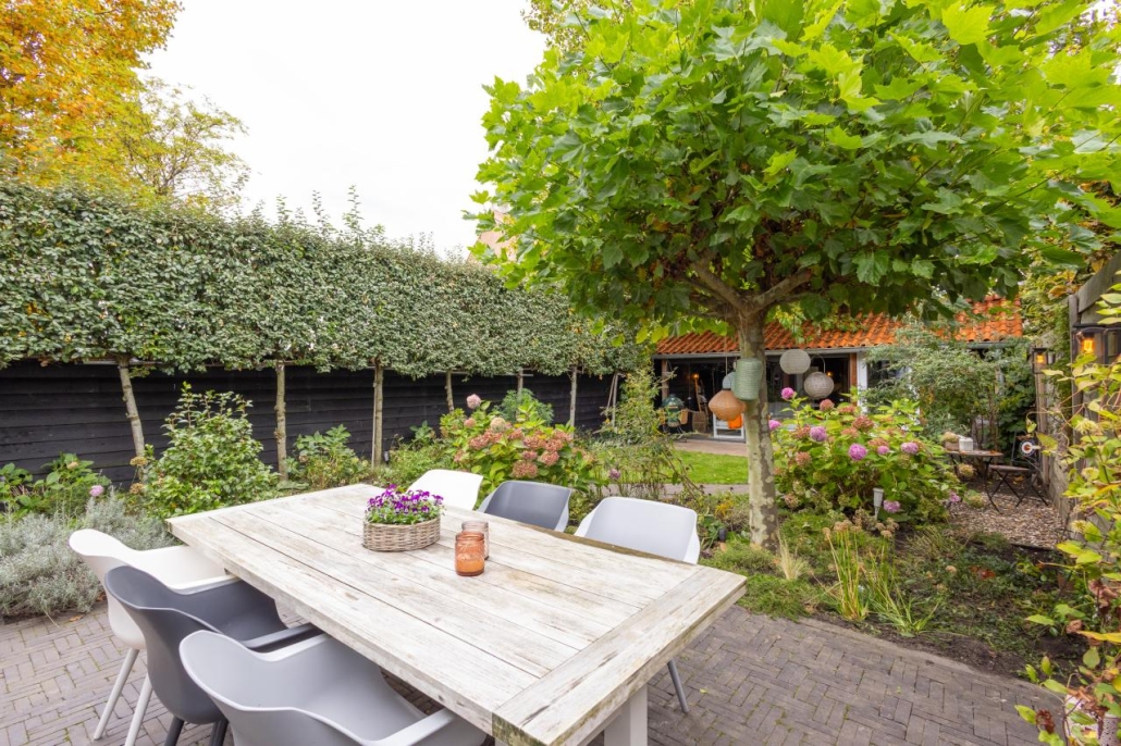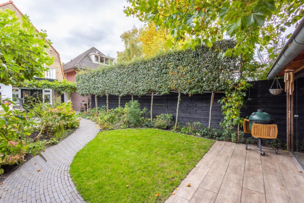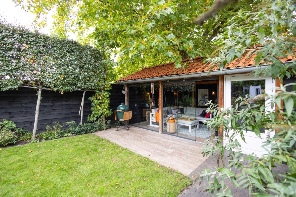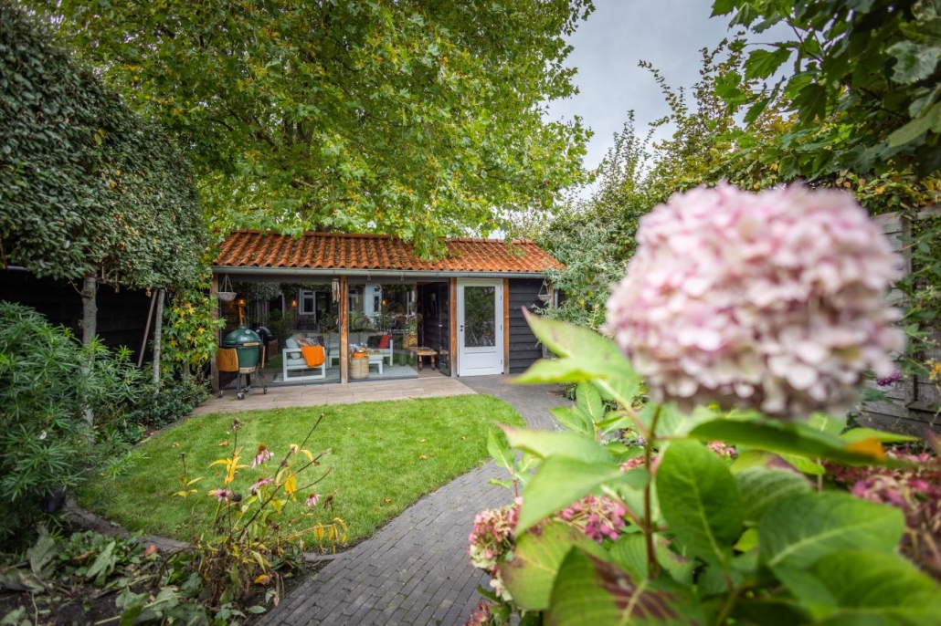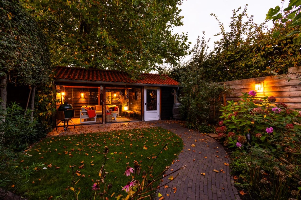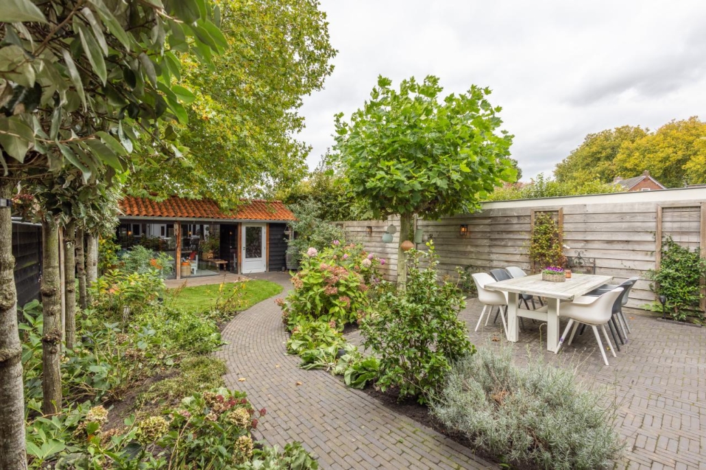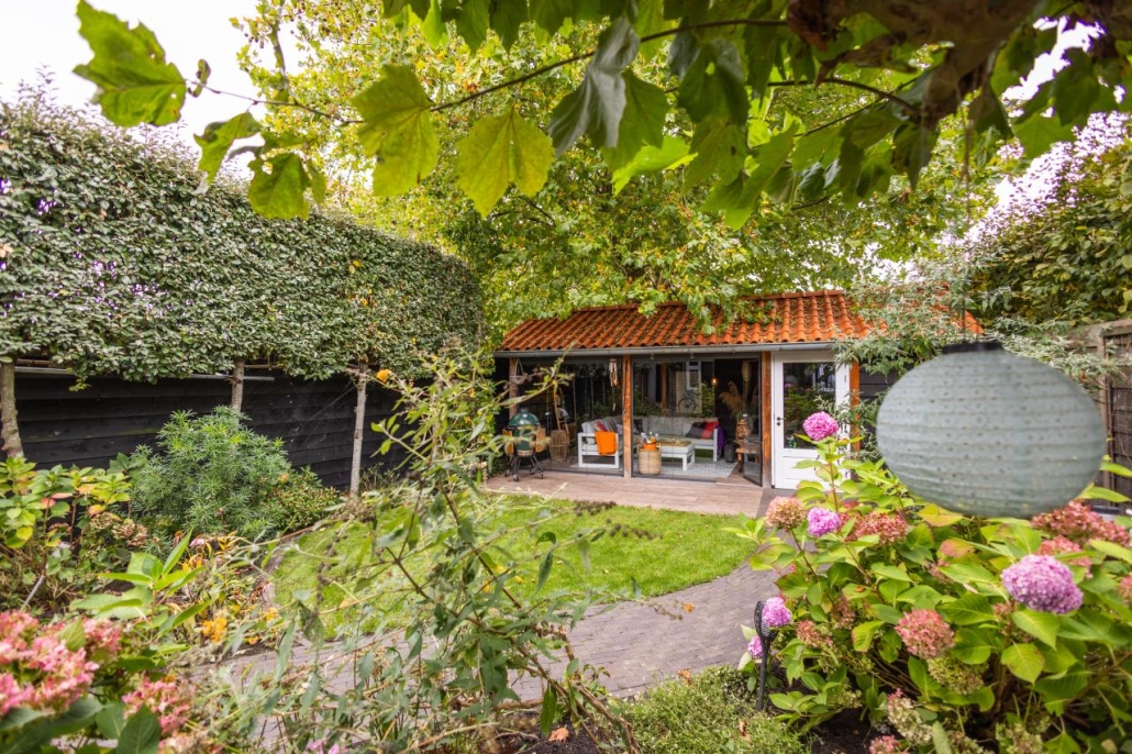 De achtertuin is speels aangelegd en vormt een sfeervolle buitenruimte met een fijne balans tussen bestrating en groen. Dankzij de gunstige ligging geniet je hier de hele dag van de zon. Achterin de tuin bevindt zich een houten serre met berging, geheel in stijl met de woning. De tuin biedt volop privacy en een heerlijke plek om in alle rust te ontspannen. Ook de voortuin is verzorgd aangelegd en draagt bij aan de charmante uitstraling van het geheel.