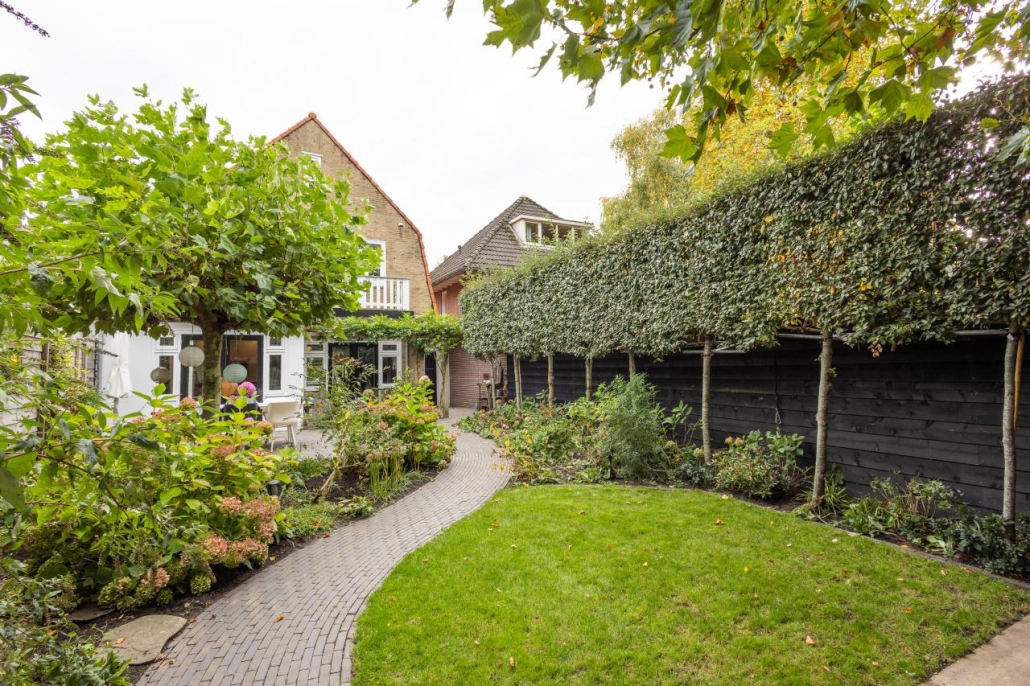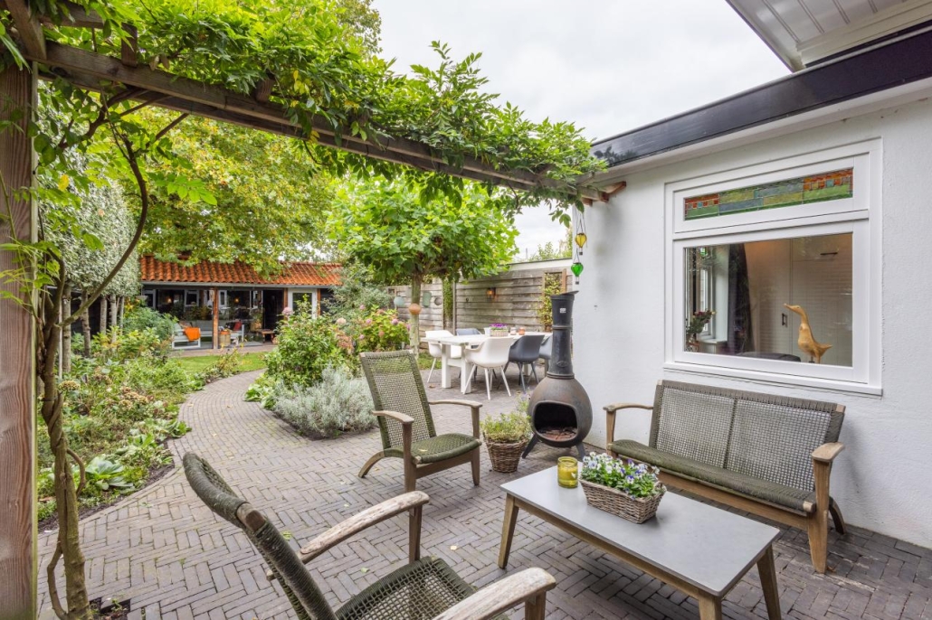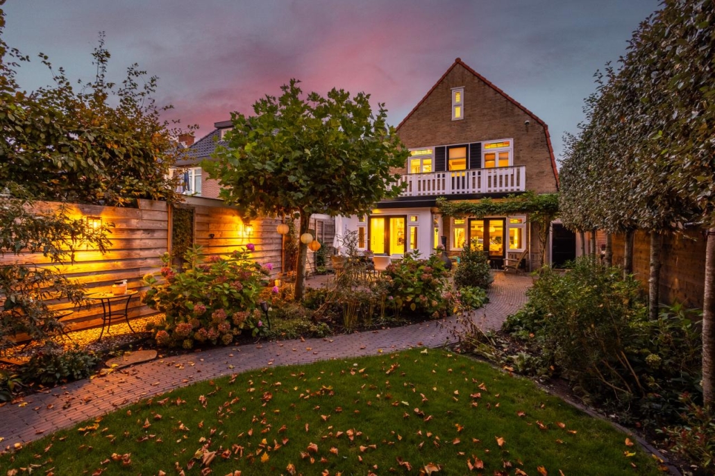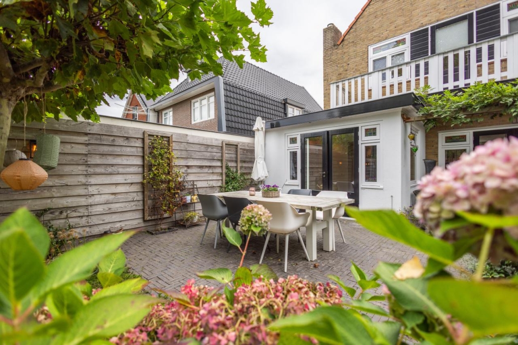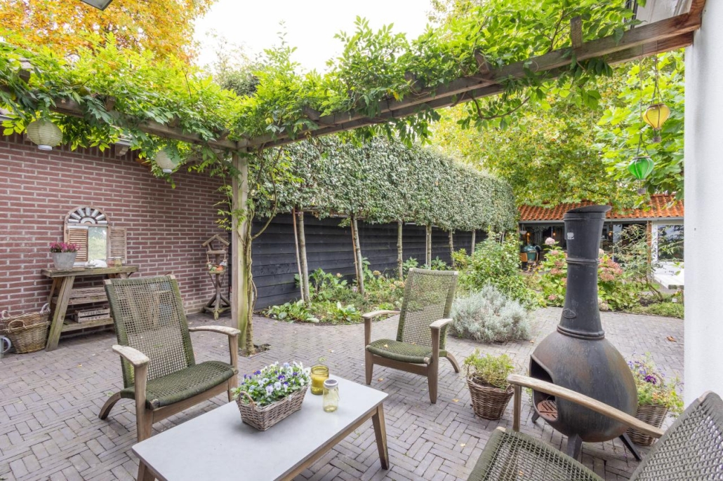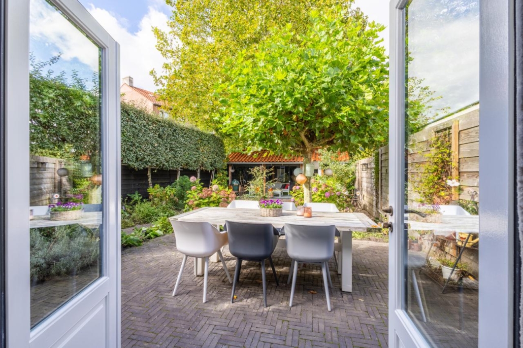 De achtertuin is speels aangelegd en vormt een sfeervolle buitenruimte met een fijne balans tussen bestrating en groen. Dankzij de gunstige ligging geniet je hier de hele dag van de zon. Achterin de tuin bevindt zich een houten serre met berging, geheel in stijl met de woning. De tuin biedt volop privacy en een heerlijke plek om in alle rust te ontspannen. Ook de voortuin is verzorgd aangelegd en draagt bij aan de charmante uitstraling van het geheel.