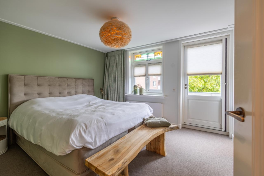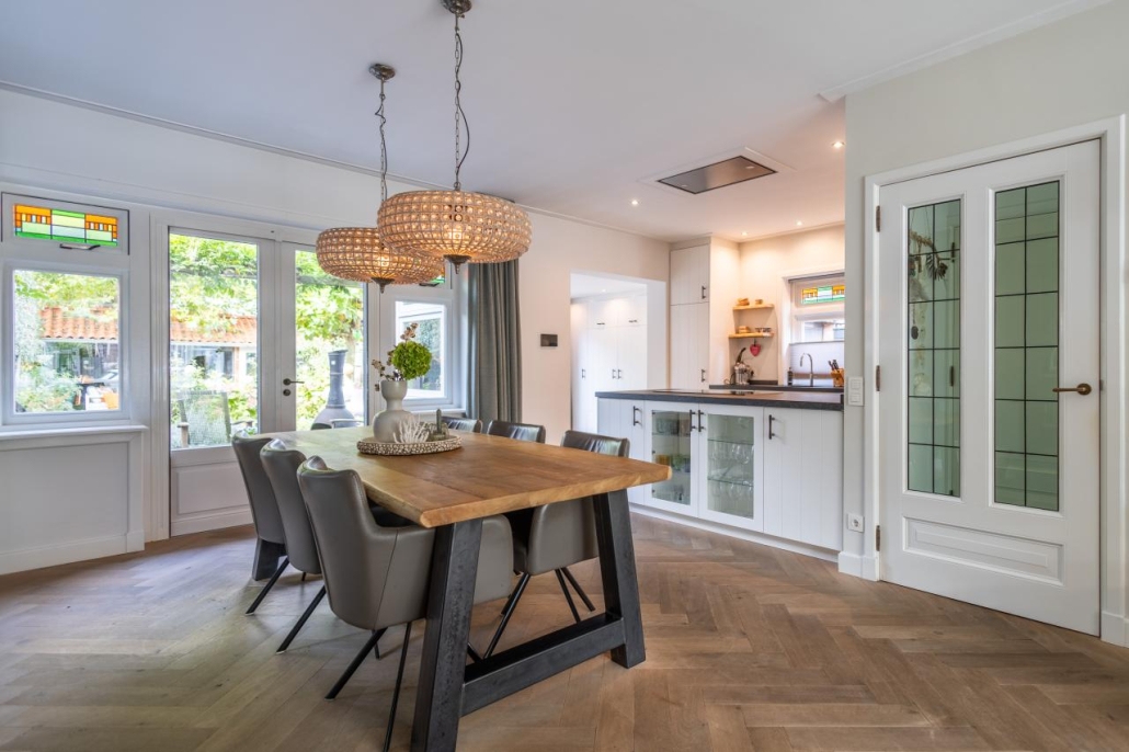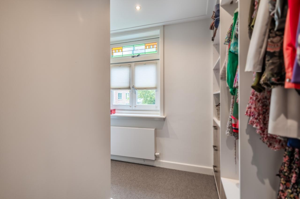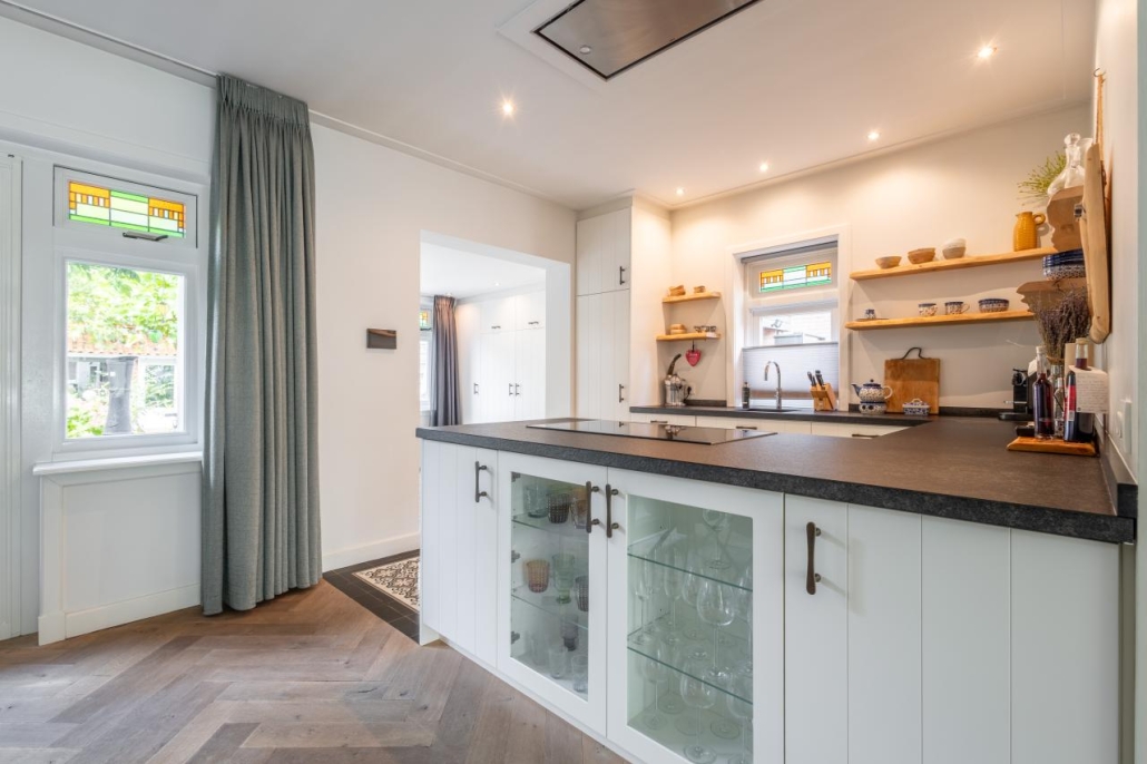 De woonkamer ademt karakter dankzij de fraaie erker aan de voorzijde, het hoge plafond en de prachtige Europees Eiken vloer. Grote raampartijen met glas-in-lood zorgen voor een prettige lichtinval. Aan de achterzijde bevindt zich de moderne, open keuken, voorzien van diverse inbouwapparatuur en afgewerkt met oog voor detail. Alle kasten in de woning zijn ontworpen en geplaatst door een professionele interieurbouwer. Via de openslaande tuindeuren loop je direct de zonnige achtertuin in. De gehele benedenverdieping beschikt over comfortabele vloerverwarming.