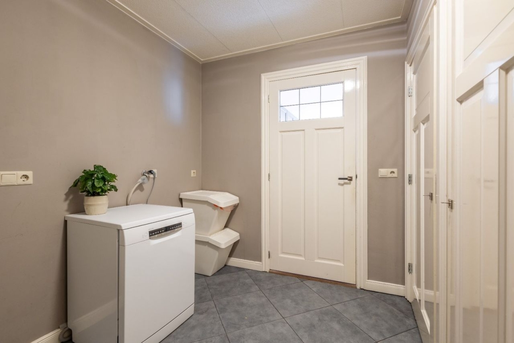 Begane grond: entrée/hal met meterkast, vaste kast; trapopgang naar de 1e verdieping, achteringang en moderne toiletruimte; lichte woonkamer voorzien van erker en laminaatvloer; middels suite deuren af te sluiten woonkeuken met complete inbouwkeuken; bijkeuken met vaste kasten en binnendoor naar de ruime garage; geïsoleerde garage met bergzolder.