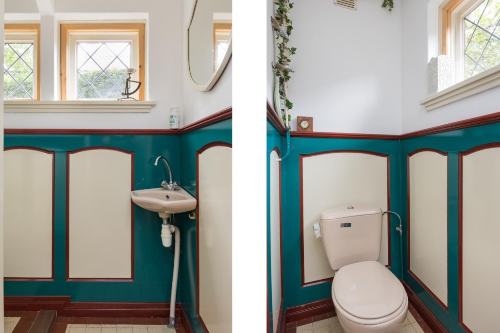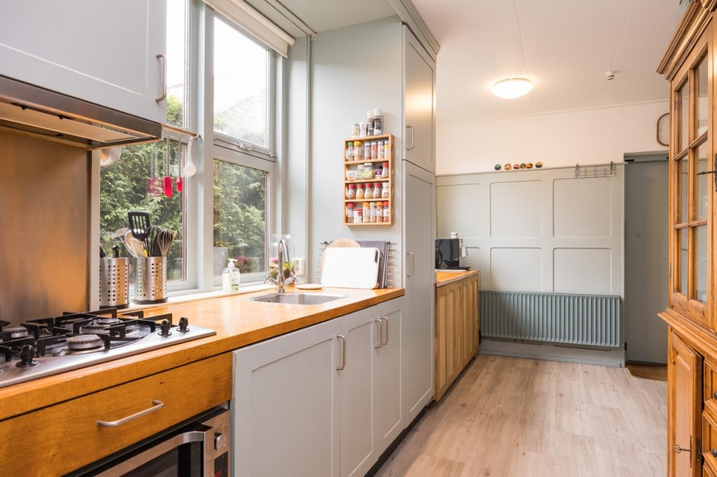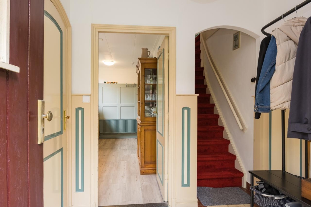 Binnenkomen doet u in de hal met originele tegelvloer. De dichte keuken is gezellig en praktisch ingedeeld met houten werkblad, inbouwapparatuur en een provisiekelder. De kamer en suite heeft een houtkachel en een sfeervolle erker: een heerlijke plek voor lange avonden.