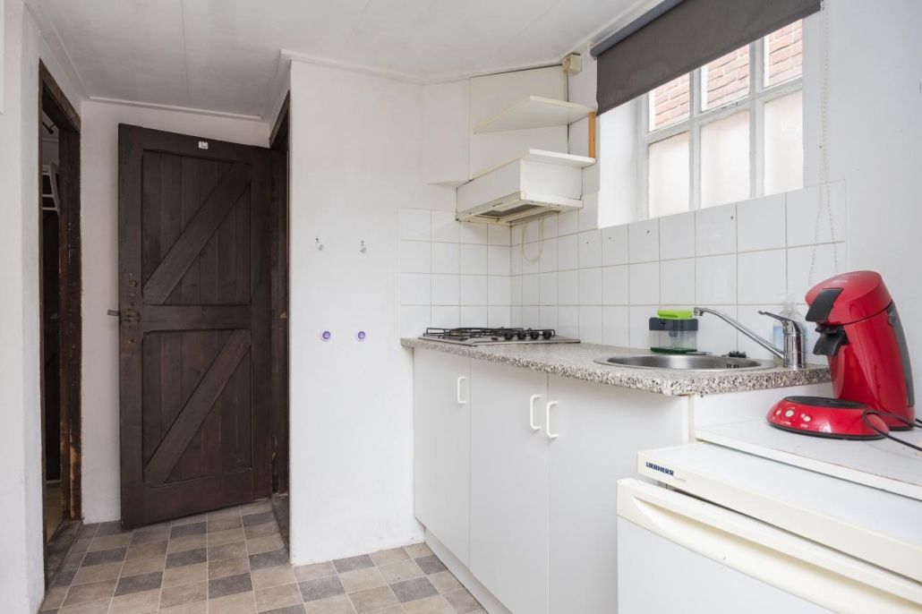 De voormalige paardenstal is omgetoverd tot een knusse studio met woon-/slaapkamer, slaapzolder, keuken, douche en toilet.