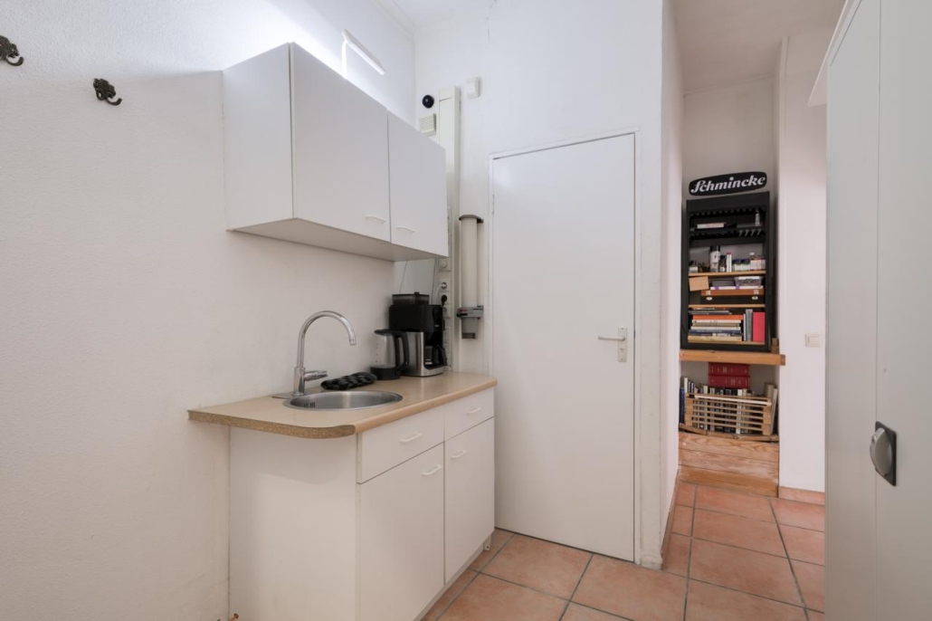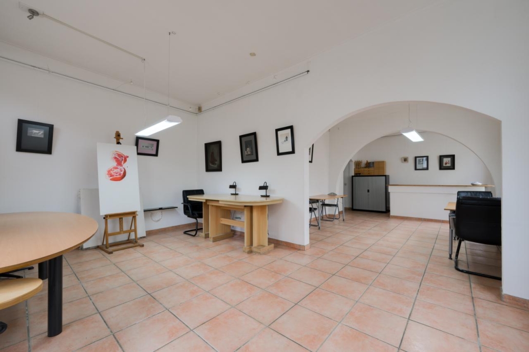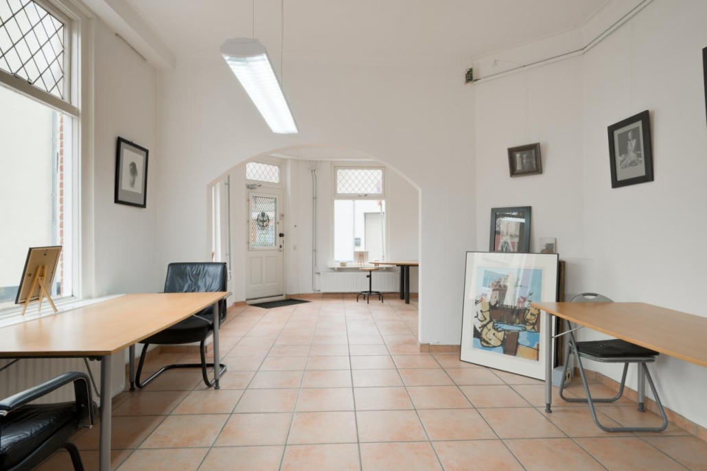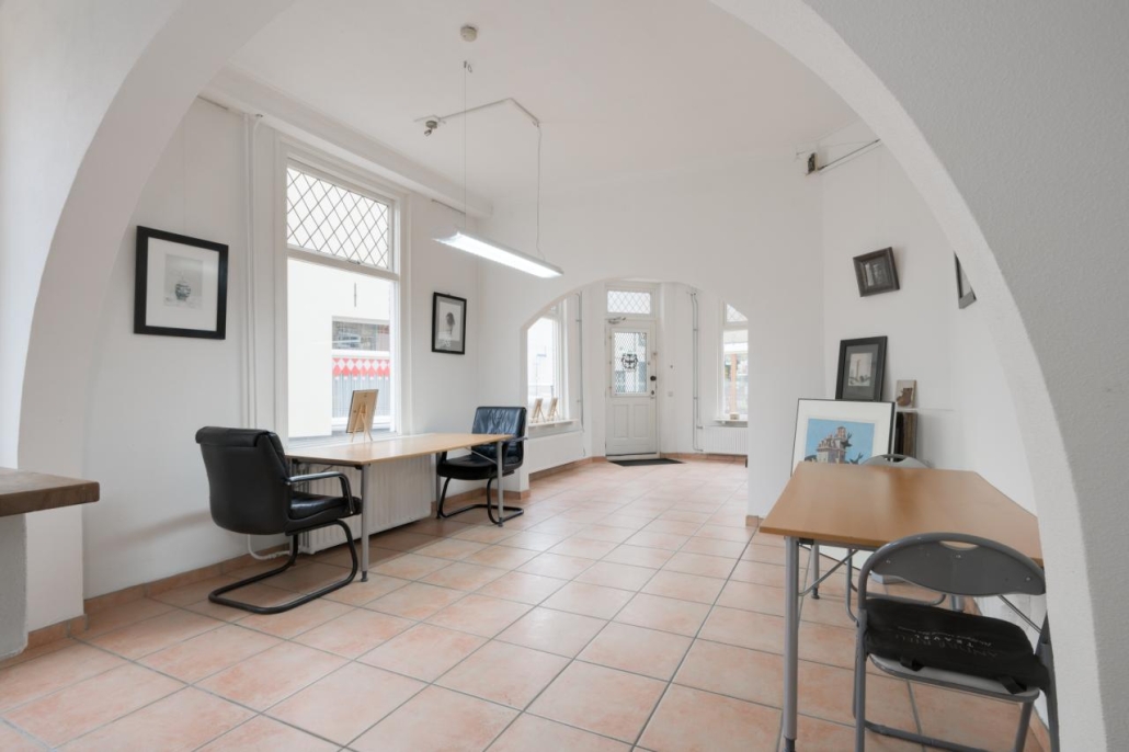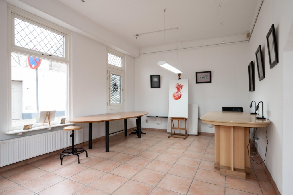 Via de entree betreed je de ruime en lichte leefruimte (thans in gebruik als atelier). Deze verdieping leent zich uitstekend om te worden ingericht als royale woonkamer met open keuken. Aansluitend bevindt zich een ruime hal met een kitchenette, toiletruimte en meterkast. Vanuit hier is er toegang tot de kelder en een tweede hal met trapopgang naar de eerste verdieping.