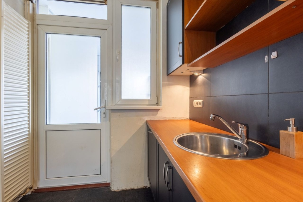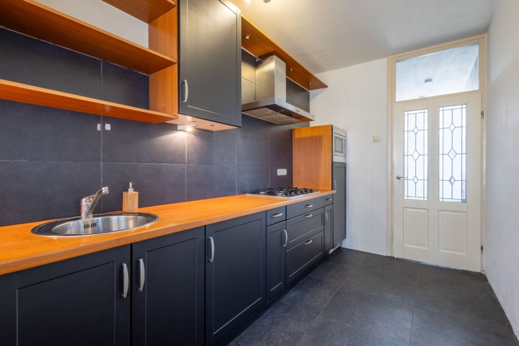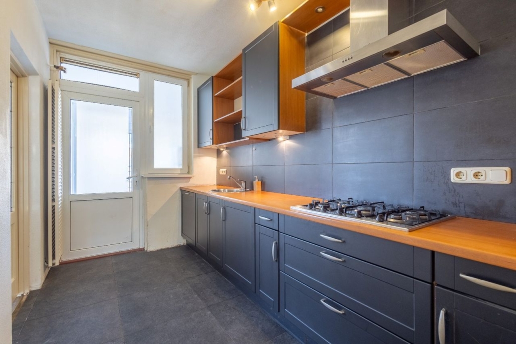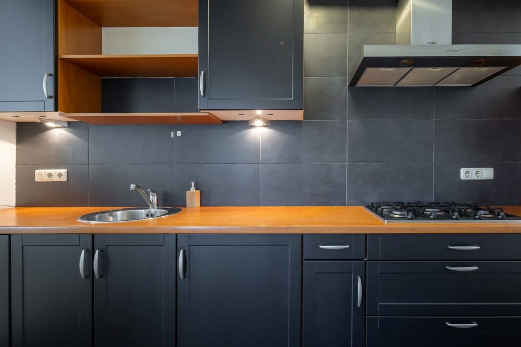 De gesloten keuken is voorzien van een inbouwkeuken met daarin een gaskookplaat, RVS afzuigkap, koelkast, vaatwasser en magnetron.
