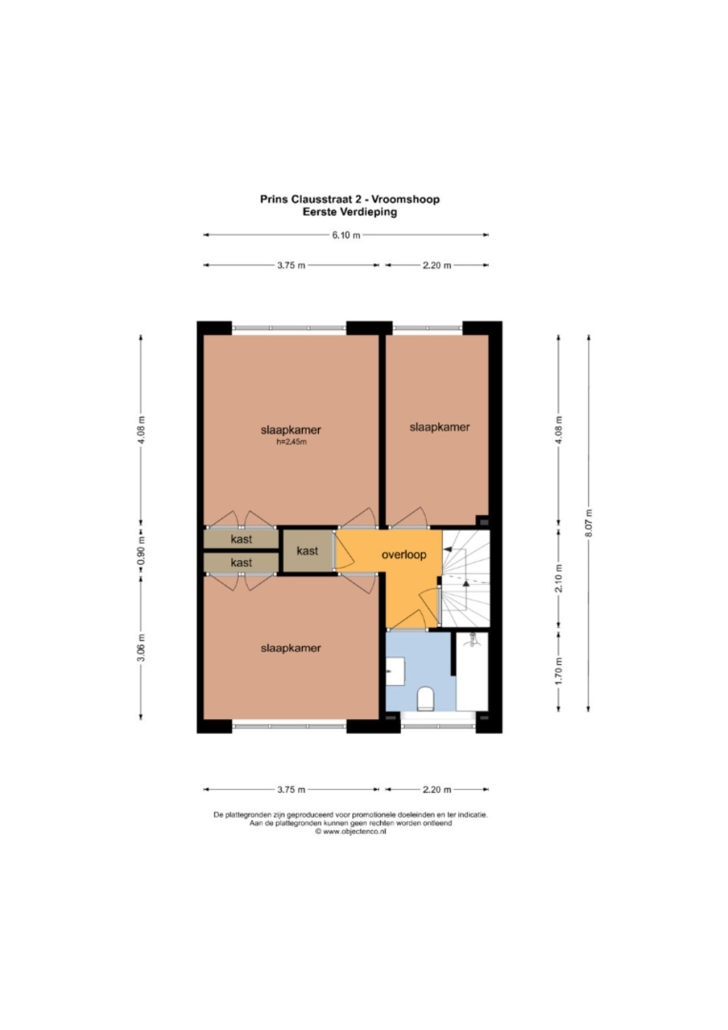 1e verdieping: overloop voorzien van trapopgang naar de 2e verdieping; 3 ruime slaapkamers, waarvan 2 met vaste kasten; moderne en complete badkamer.