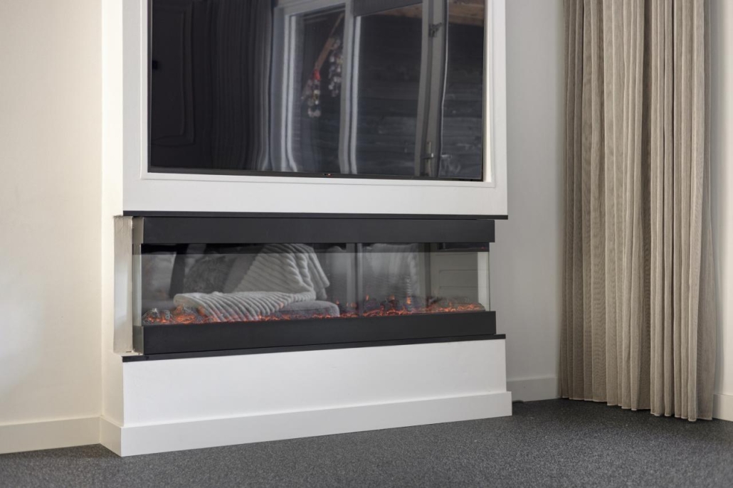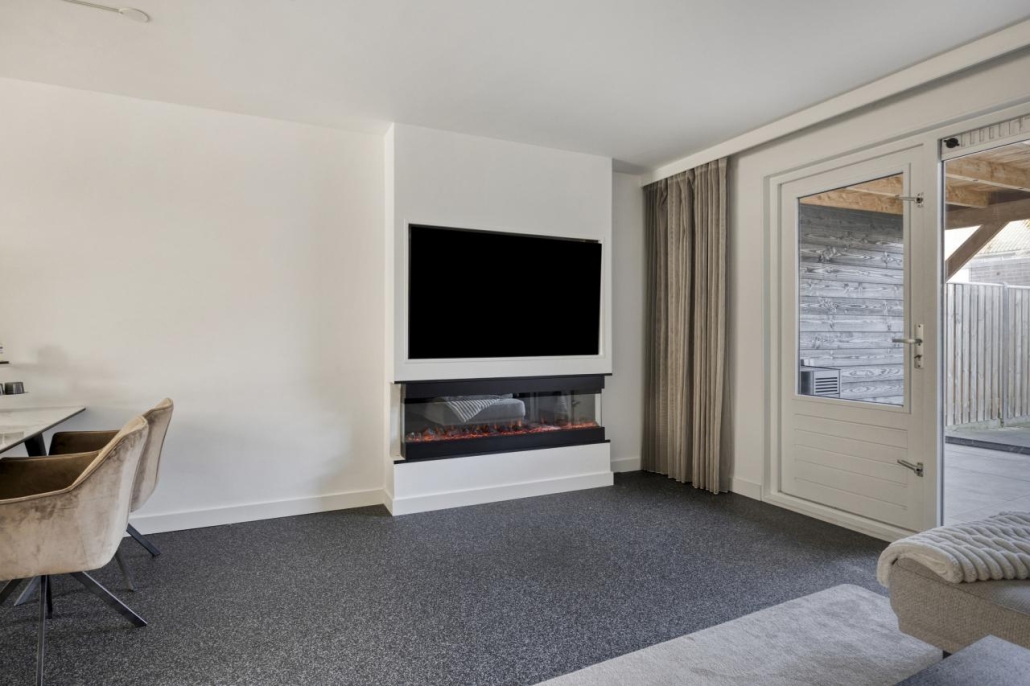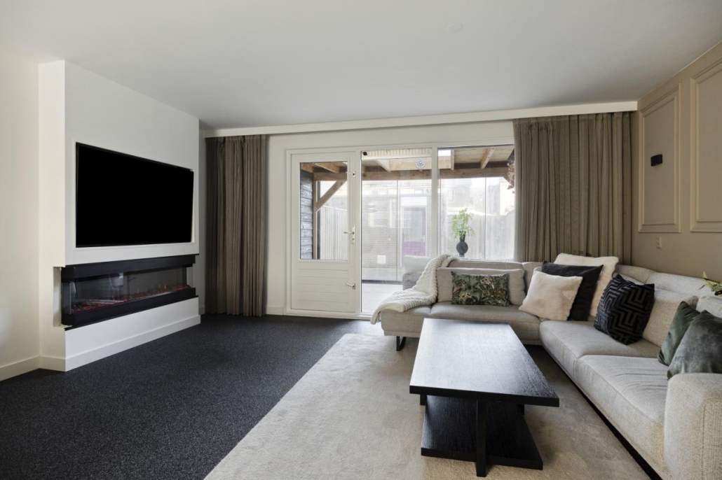 Entree/hal met toegang tot de toiletruimte. De lichte, tuingerichte woonkamer is voorzien van vloerverwarming en een cinewall met 3D haard en biedt directe toegang tot zowel de diepe achtertuin als de prachtige overkapping/serre. Aan de voorzijde ligt de moderne woonkeuken, uitgerust met onder andere een inductiekookplaat, oven, koelkast en vaatwasser. Vanuit de woonkamer bereik je de trapopgang naar de eerste verdieping. Daarnaast zijn er twee ruime bergkasten aanwezig.