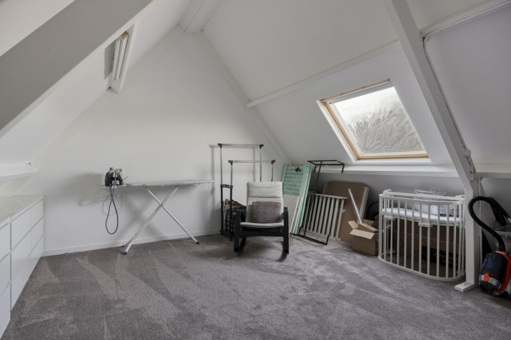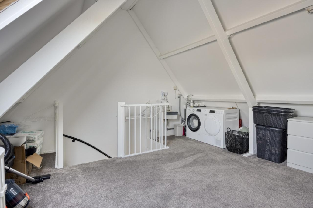Ruime open zolderverdieping met was en droogopstelling en voldoende bergruimte. Hier is zeer eenvoudig een vierde slaapkamer te creëren.