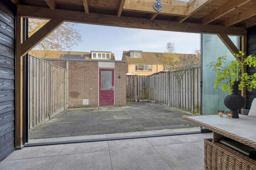 De diepe achtertuin op het noordoosten beschikt over zowel zon- als schaduwplekken door de lengte van het perceel. De grote overkapping/serre zorgt voor een extra fijne leefruimte buitenshuis. Achterin de tuin staat een ruime stenen berging, ideaal voor fietsen en extra opslag.