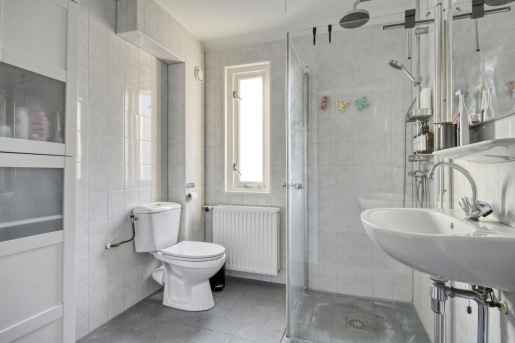 Overloop met toegang tot drie goed bemeten slaapkamers. De keurige badkamer beschikt over een douche, toilet en wastafel en biedt mogelijkheden voor toekomstige modernisering.