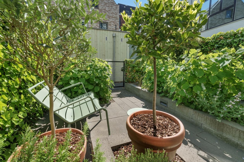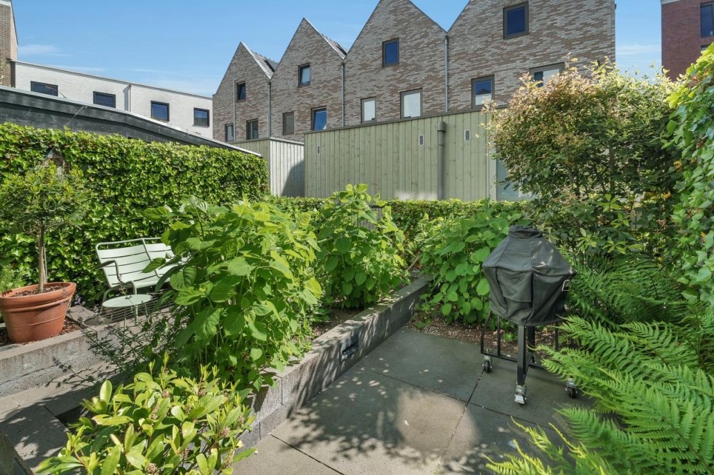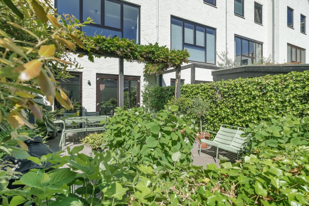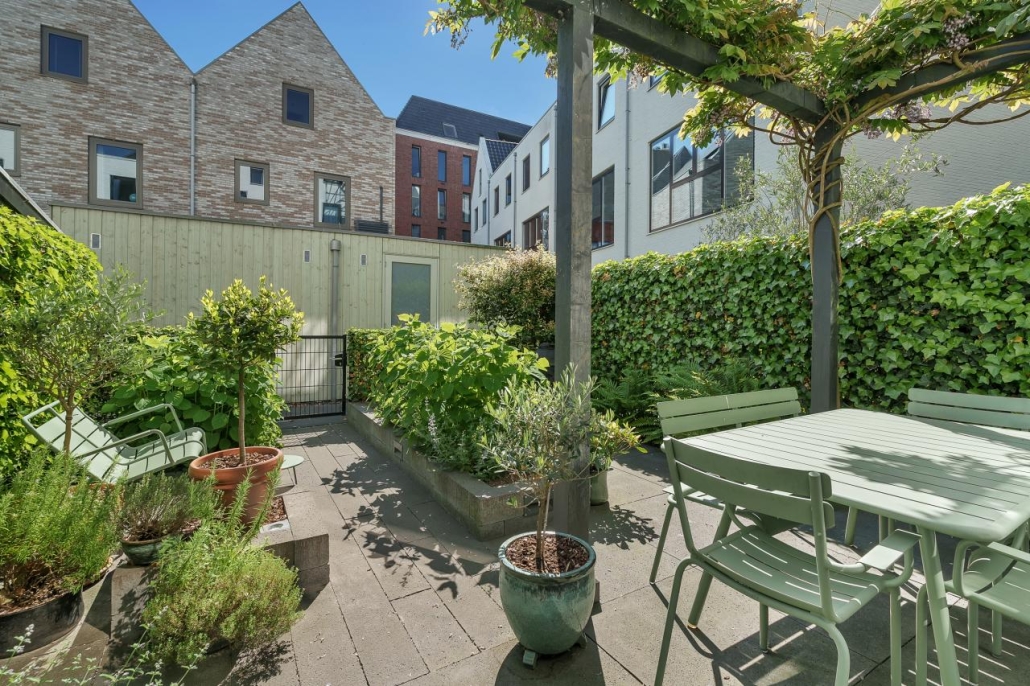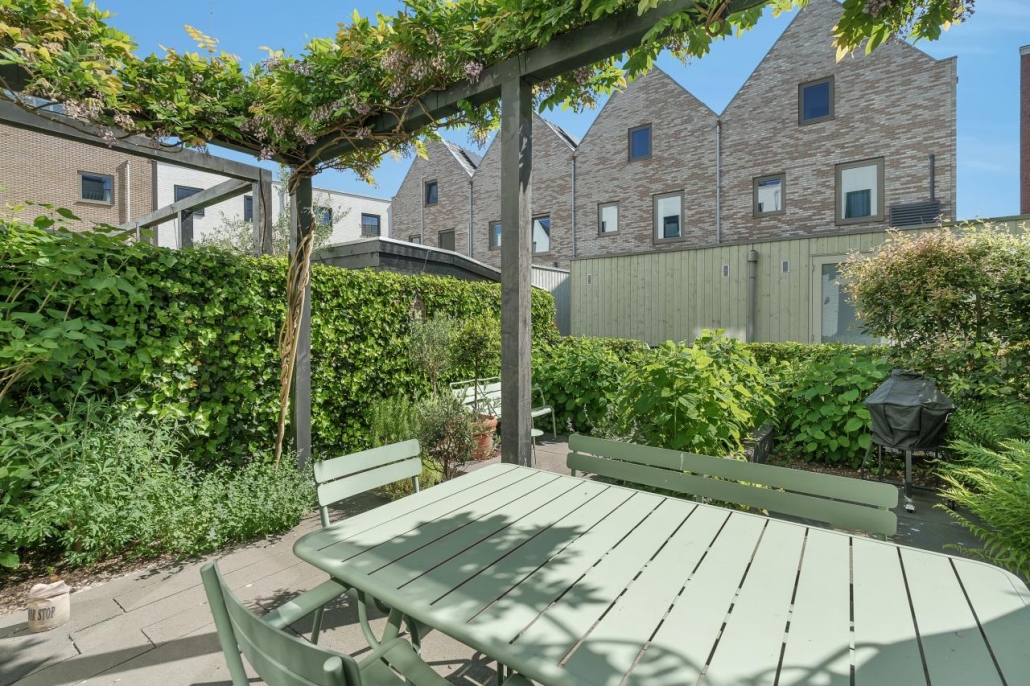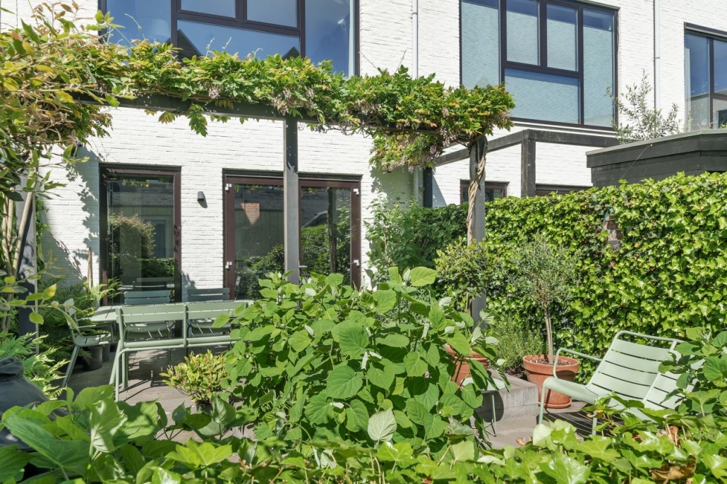 De achtertuin is smaakvol aangelegd met een royaal terras en voldoende ruimte om te ontspannen, dineren of gasten te ontvangen.