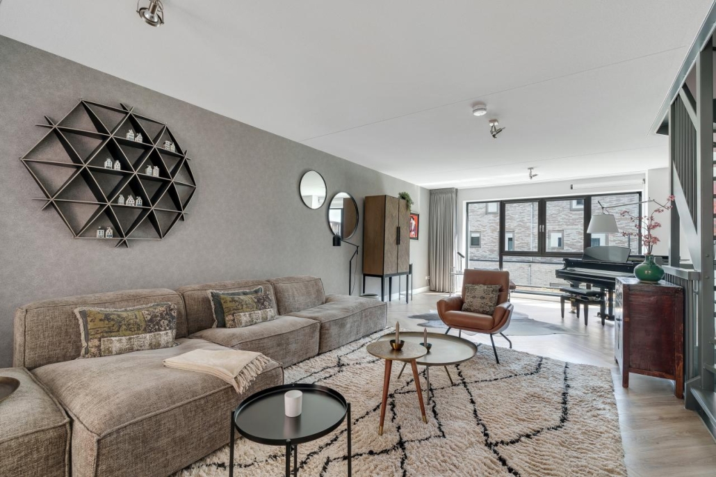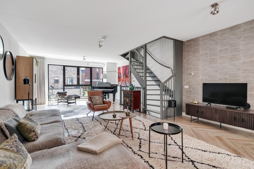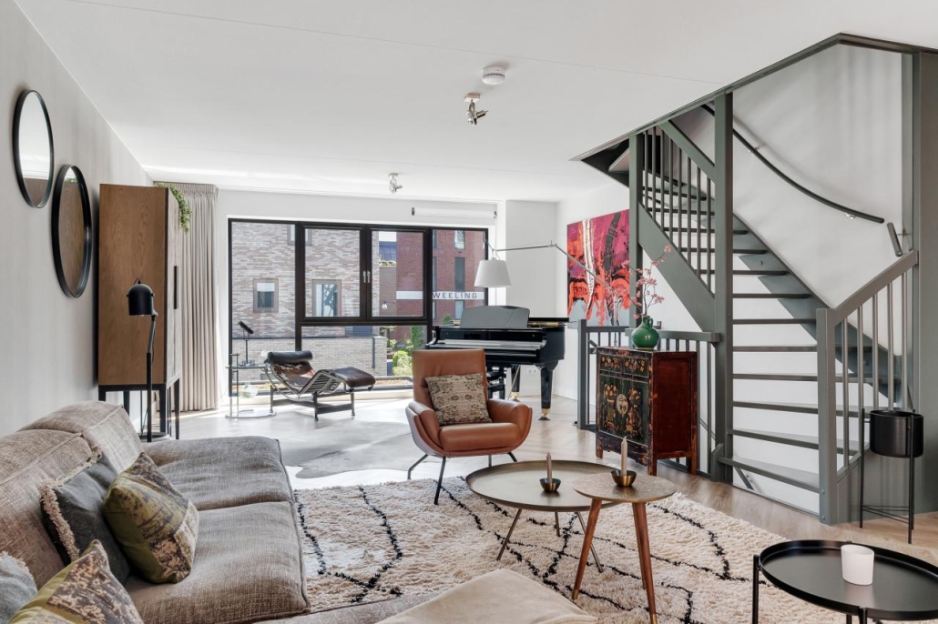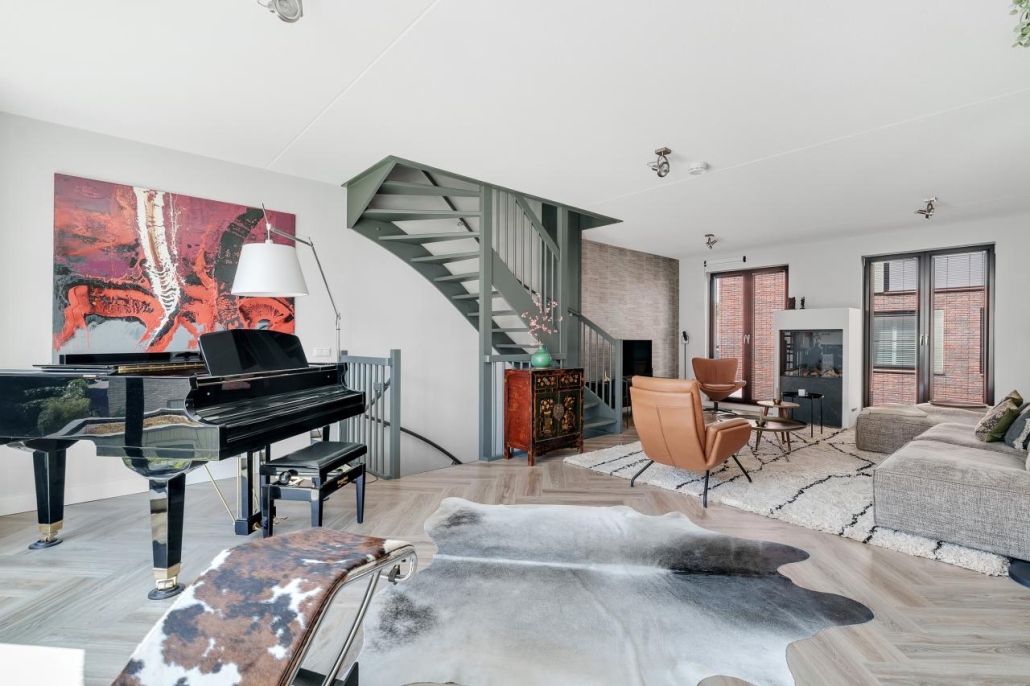 De eerste verdieping is volledig ingericht als riante woonkamer, een unieke leefruimte. Met aan beide zijden grote raampartijen en voldoende ruimte voor meerdere zithoeken.