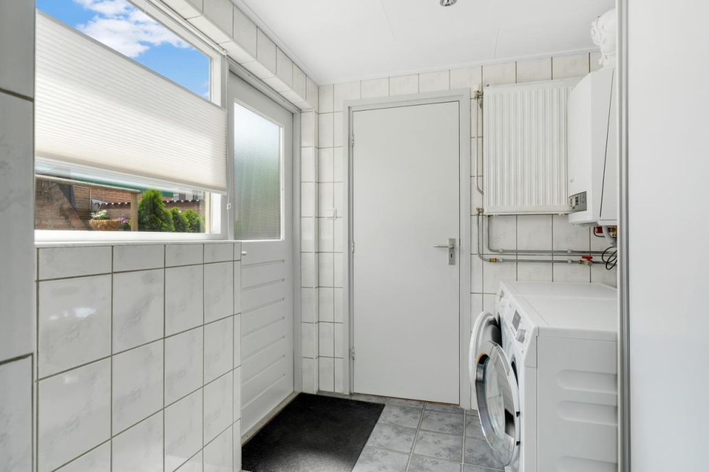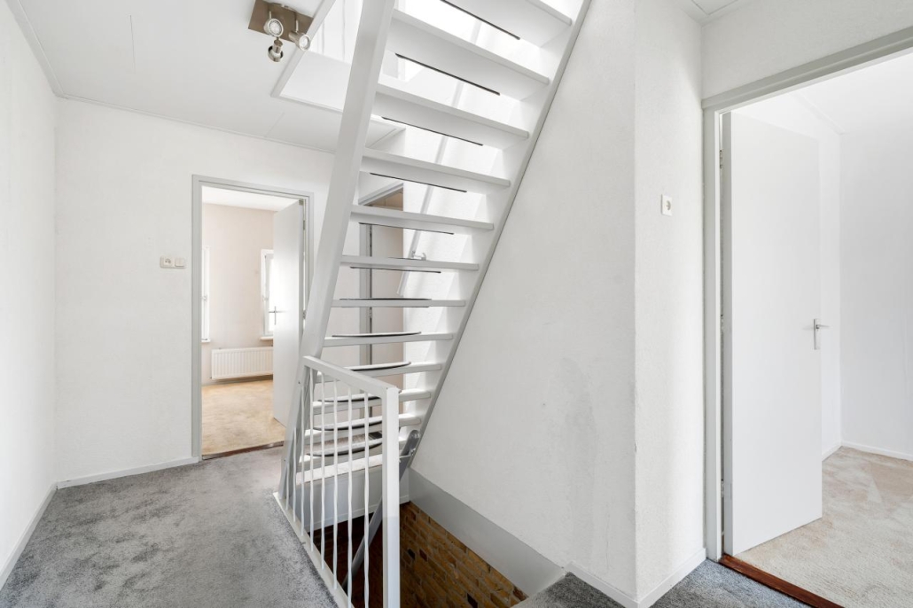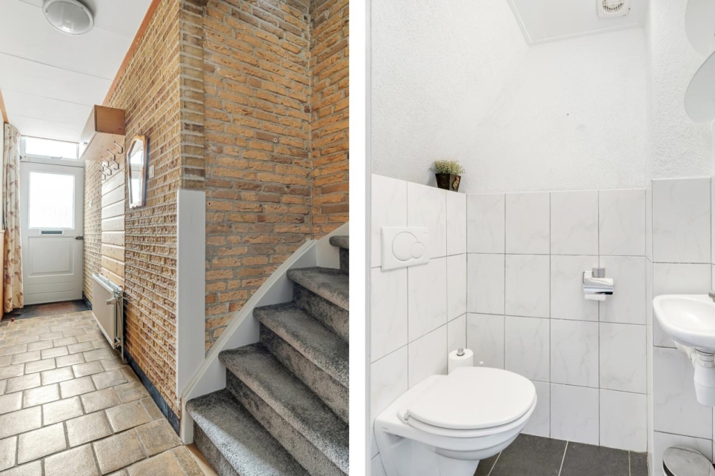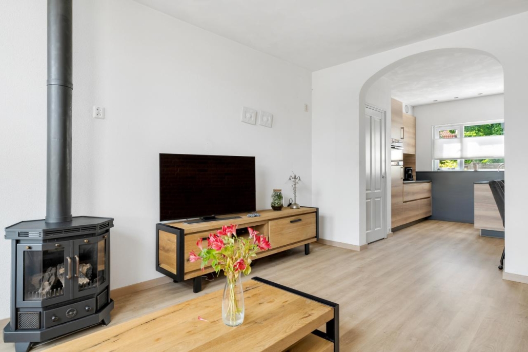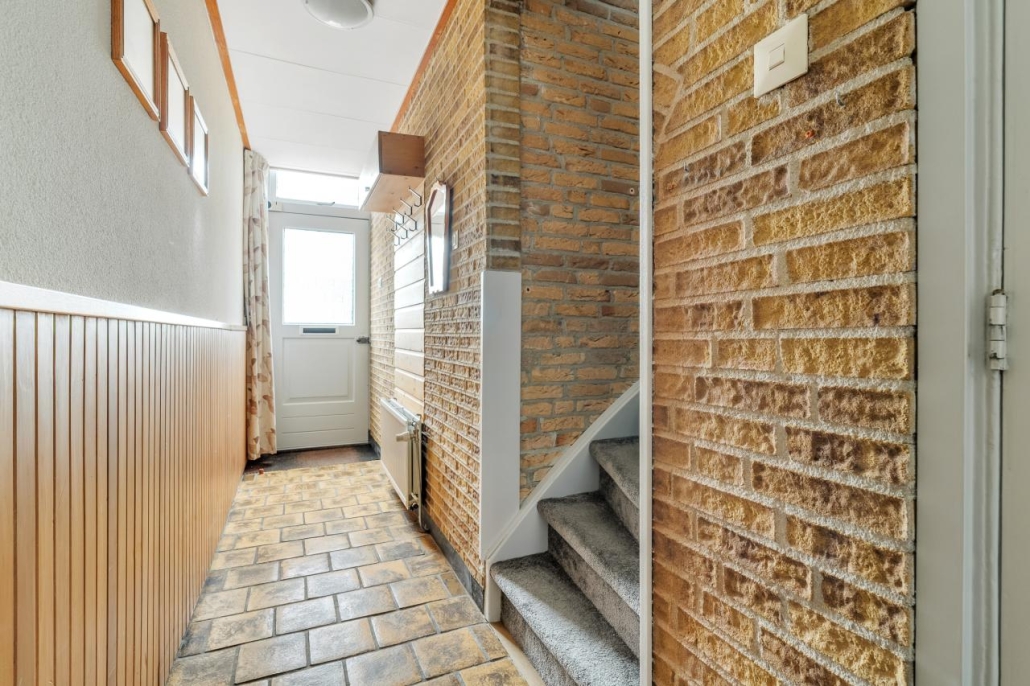 Bij binnenkomst sta je in een nette hal met garderoberuimte, een toilet, de meterkast en de trap naar boven. Vanuit hier loop je door naar de keuken, die direct grenst aan de gezellige woonkamer. De keuken is uitgerust met alle benodigde inbouwapparatuur en biedt toegang tot de kelder, een praktische bijkeuken met witgoedaansluiting en een extra kamer die perfect dienst kan doen als thuiswerkplek of hobbyruimte.