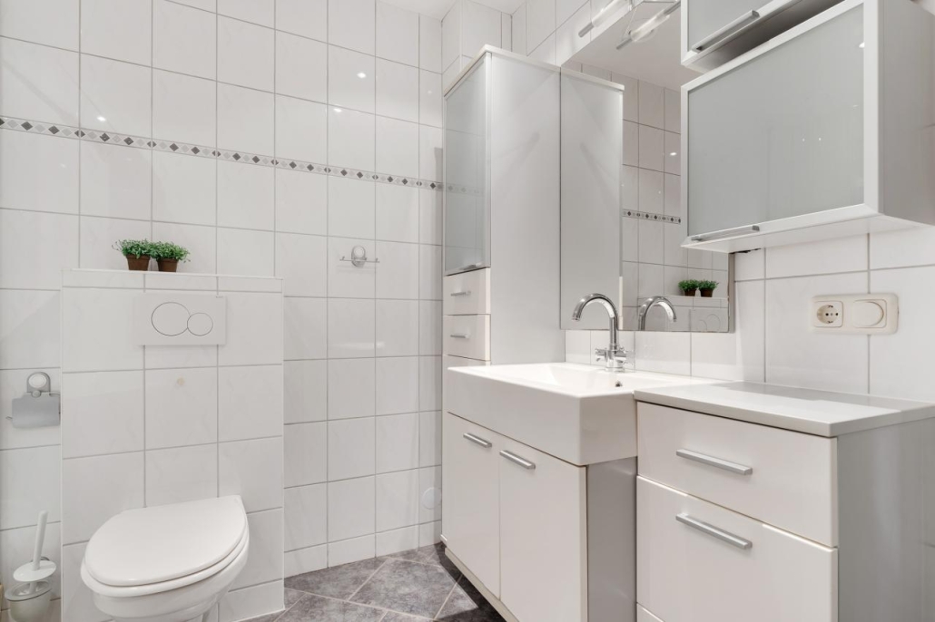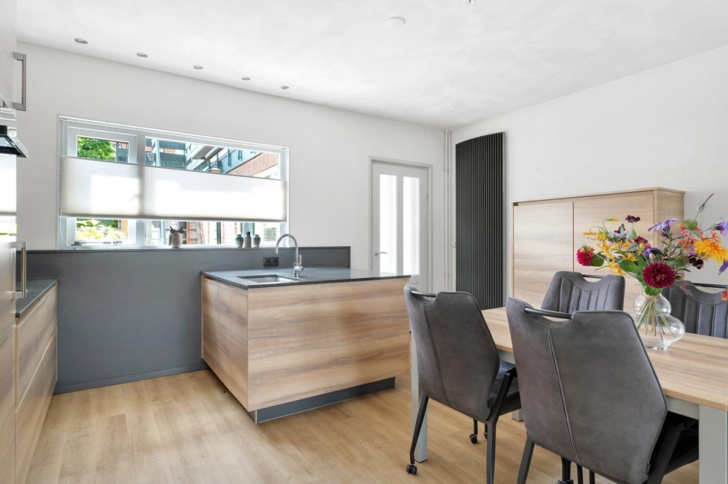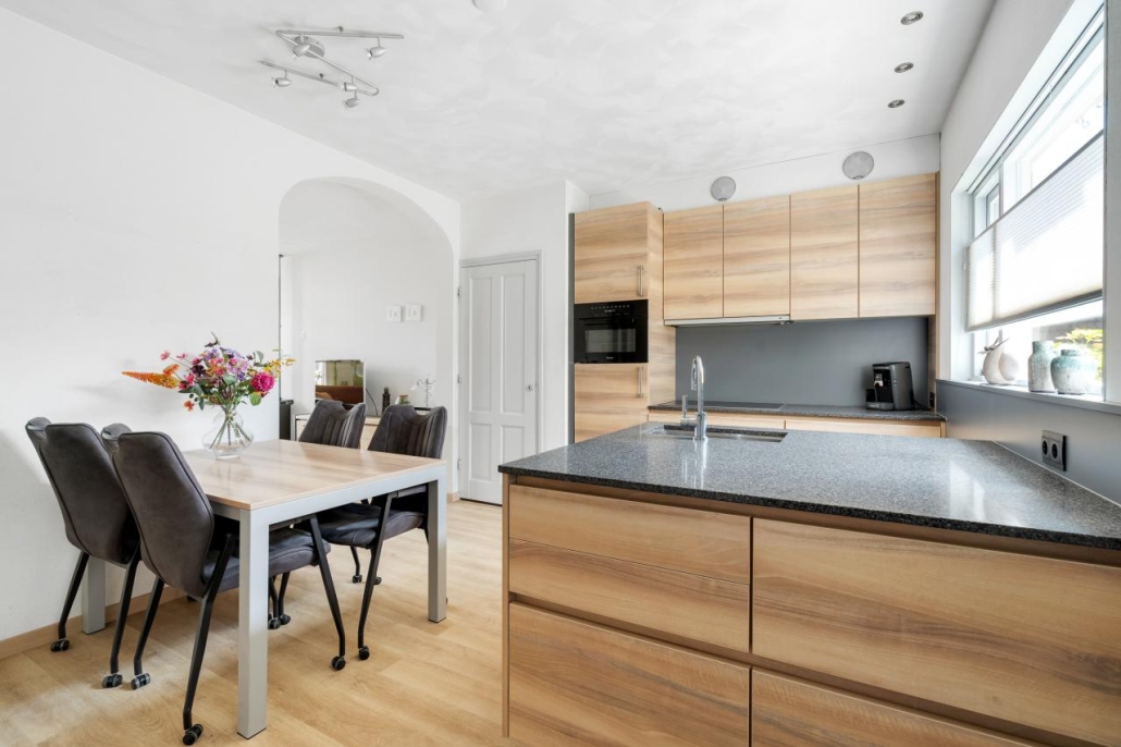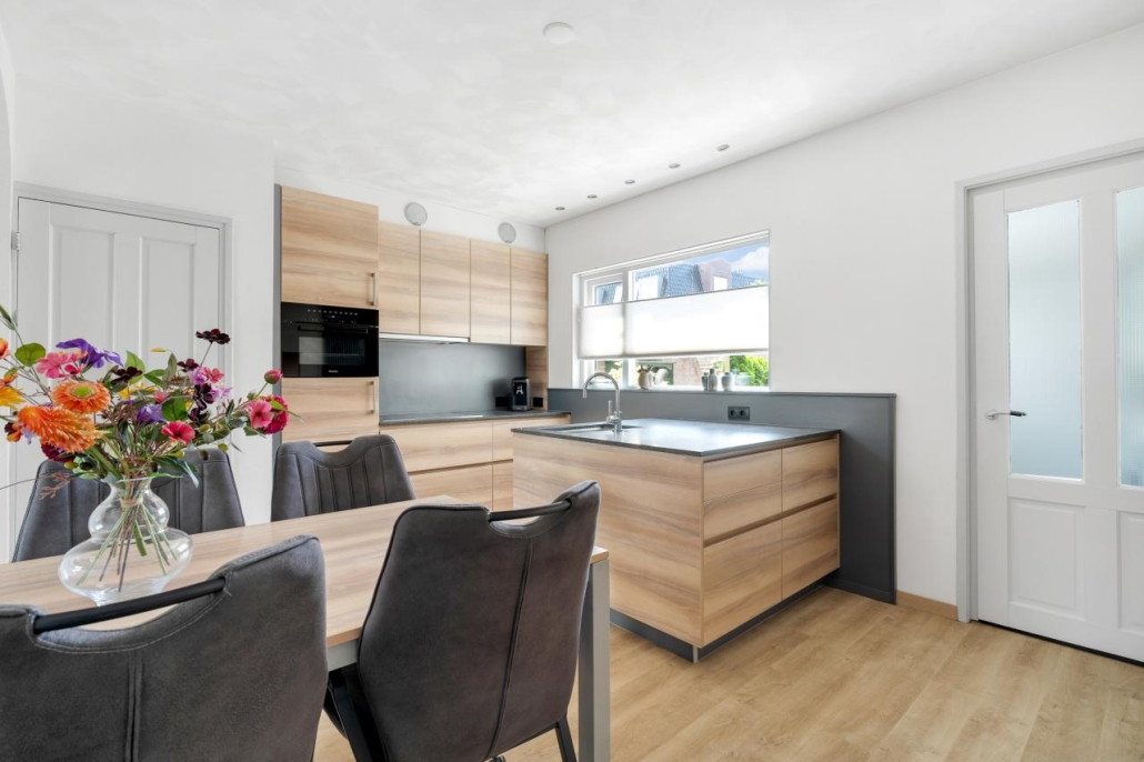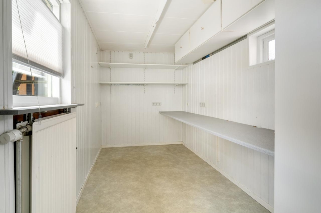 Bij binnenkomst sta je in een nette hal met garderoberuimte, een toilet, de meterkast en de trap naar boven. Vanuit hier loop je door naar de keuken, die direct grenst aan de gezellige woonkamer. De keuken is uitgerust met alle benodigde inbouwapparatuur en biedt toegang tot de kelder, een praktische bijkeuken met witgoedaansluiting en een extra kamer die perfect dienst kan doen als thuiswerkplek of hobbyruimte.