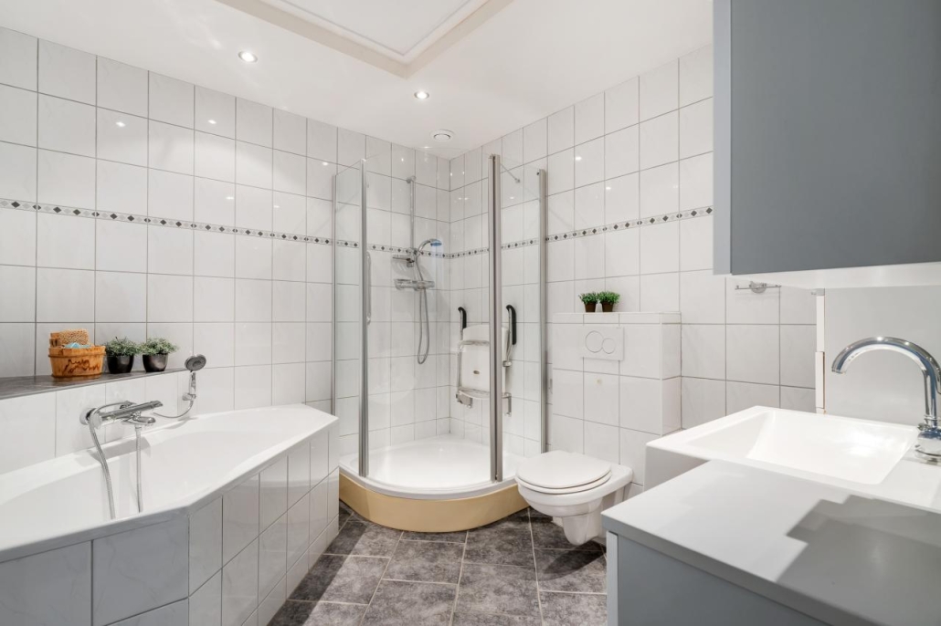 Op de eerste verdieping bevinden zich drie volwaardige slaapkamers en een ruime badkamer. Deze is voorzien van een ligbad, inloopdouche, tweede toilet en een wastafel. Eén van de slaapkamers aan de achterzijde heeft directe toegang tot een heerlijk dakterras, een fijne extra buitenruimte met zicht op de tuin