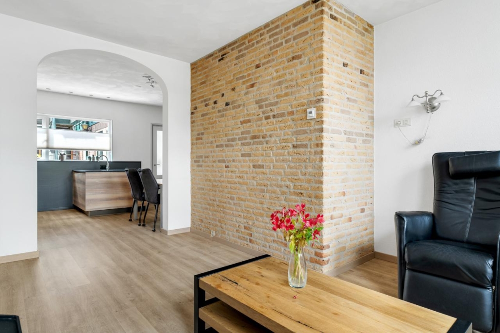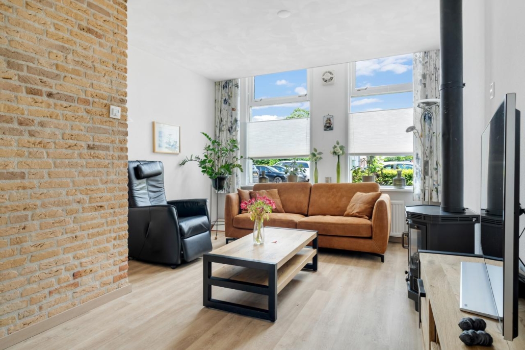 De woonkamer is aan de straatzijde gelegen en ademt sfeer dankzij de hoge plafonds en grote raampartijen. Hierdoor geniet je van veel natuurlijk licht en een ruimtelijk gevoel.
