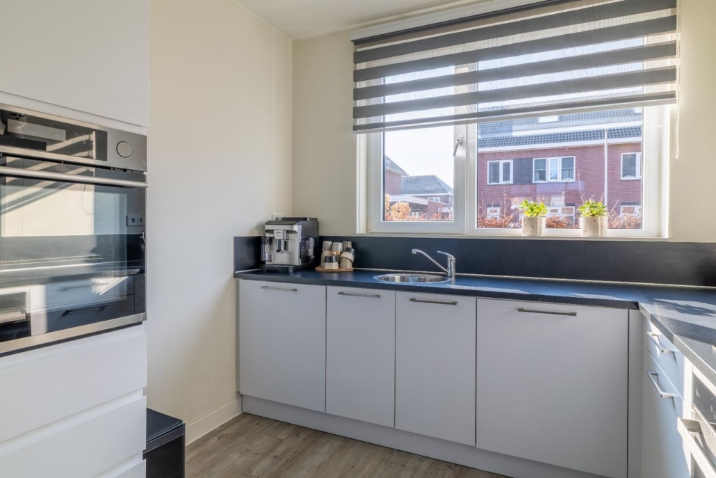 Begane grond: entrée/hal met meterkast, moderne toiletruimte en trapopgang naar de 1e verdieping; L-vormige woonkamer voorzien van een vaste kast en deur naar het terras; luxe inbouwkeuken.