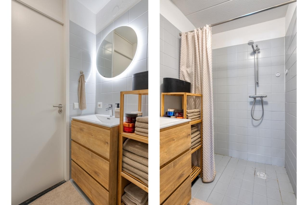 De badkamer is modern en slim ingedeeld. Grijze tegels, een stijlvol wastafelmeubel met houtlook en een royale inloopdouche maken dit tot een heerlijke plek om de dag fris te beginnen. Het toilet is separaat gesitueerd in de hal en is in dezelfde moderne stijl uitgevoerd (vrijhangend met fontein).