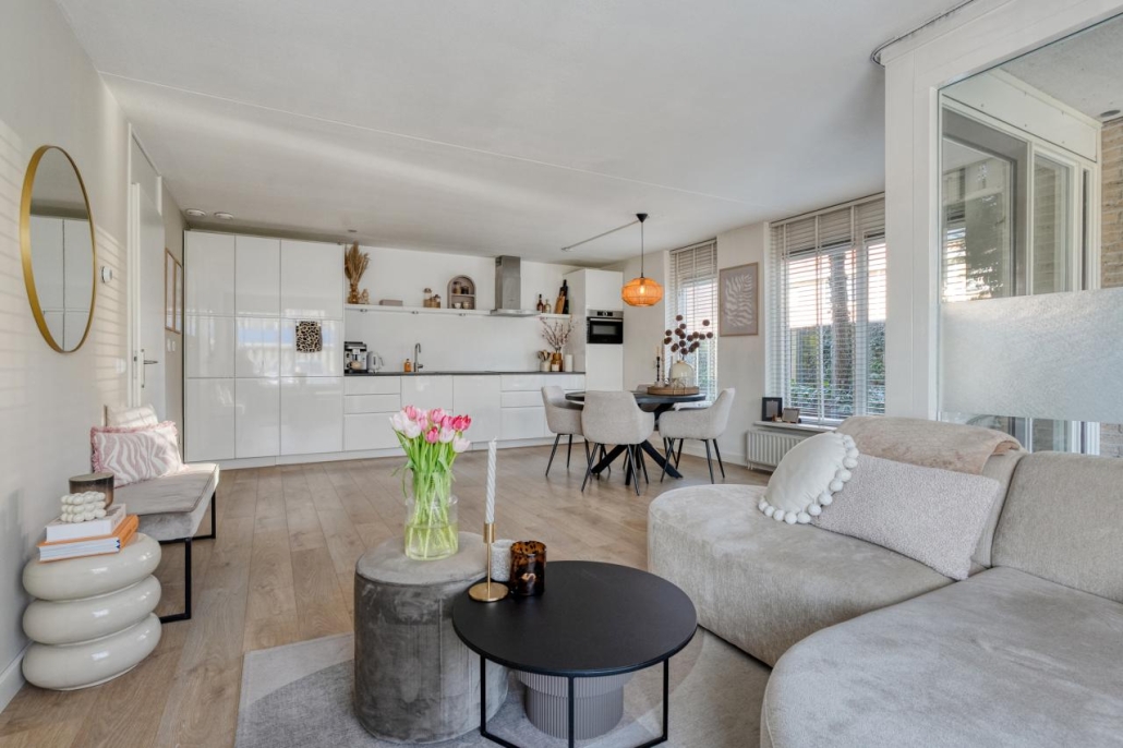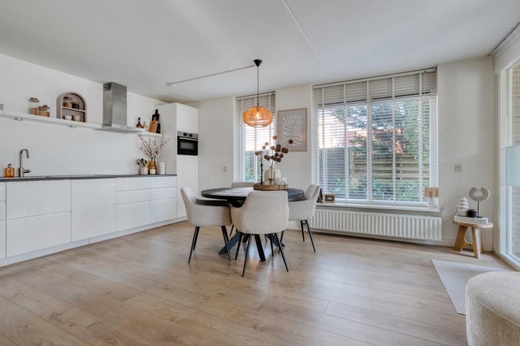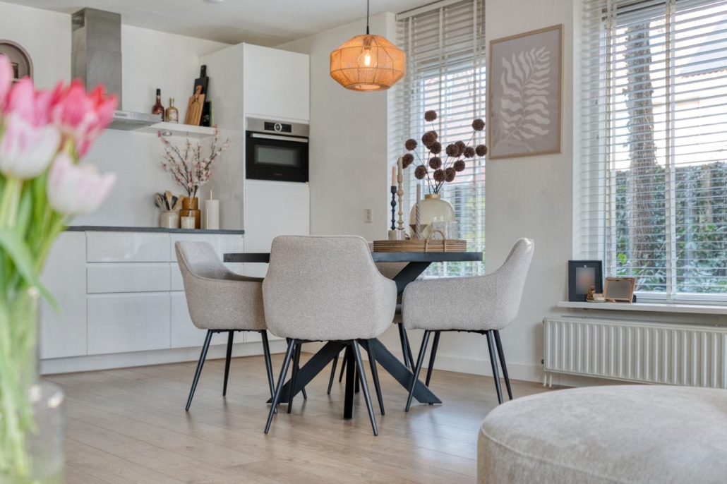 De woonkamer is een plaatje. Dankzij de grote raampartijen stroomt het daglicht rijkelijk naar binnen. De ruimte is breed opgezet, waardoor er een natuurlijke verdeling is ontstaan tussen de gezellige zithoek en de eethoek die direct grenst aan de open keuken.
