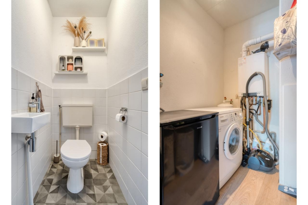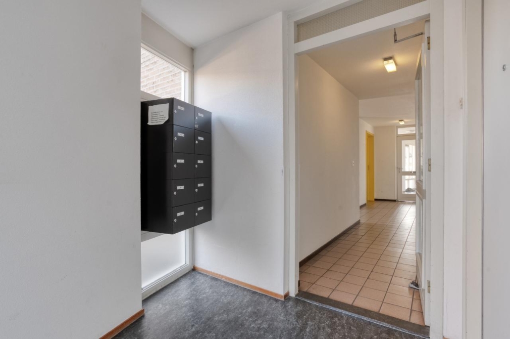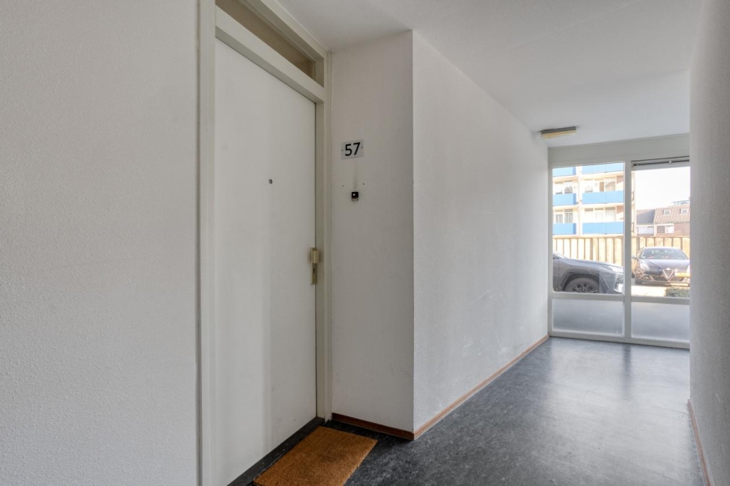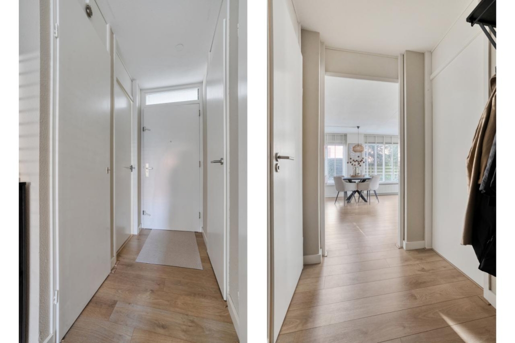 De centrale entree met brievenbussen en intercominstallatie geeft toegang tot de galerij. Eenmaal binnen in het appartement zet de hal direct de toon: fris, modern en keurig afgewerkt met een lichte, doorlopende vloer. In de hal vindt u tevens een praktische inpandige berging met de opstelling voor de CV-ketel en de aansluitingen voor uw wasapparatuur.