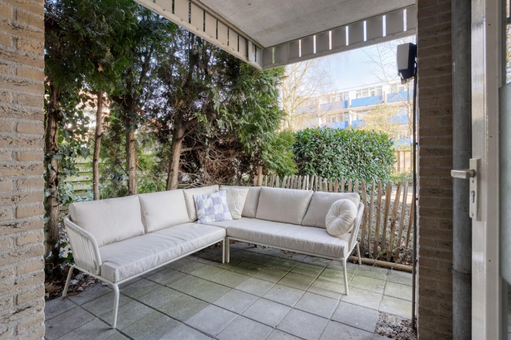 Via de glazen pui in de woonkamer bereikt u het overdekte terras. Dit is een heerlijk verlengstuk van uw woongenot; beschut, privé en ideaal om al vroeg in het voorjaar buiten te kunnen zitten.