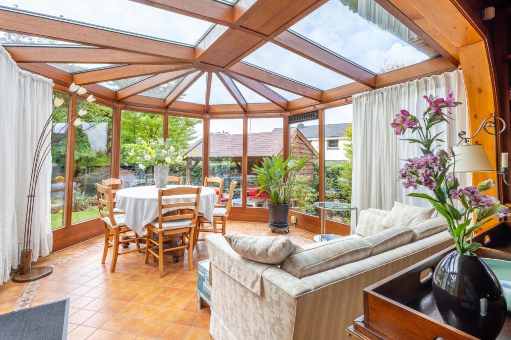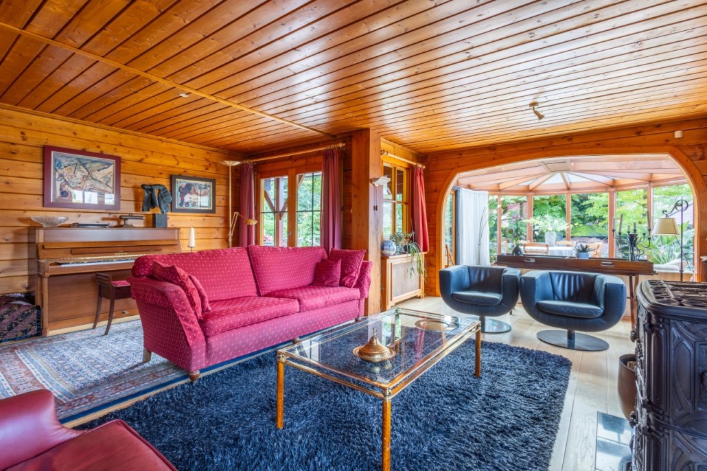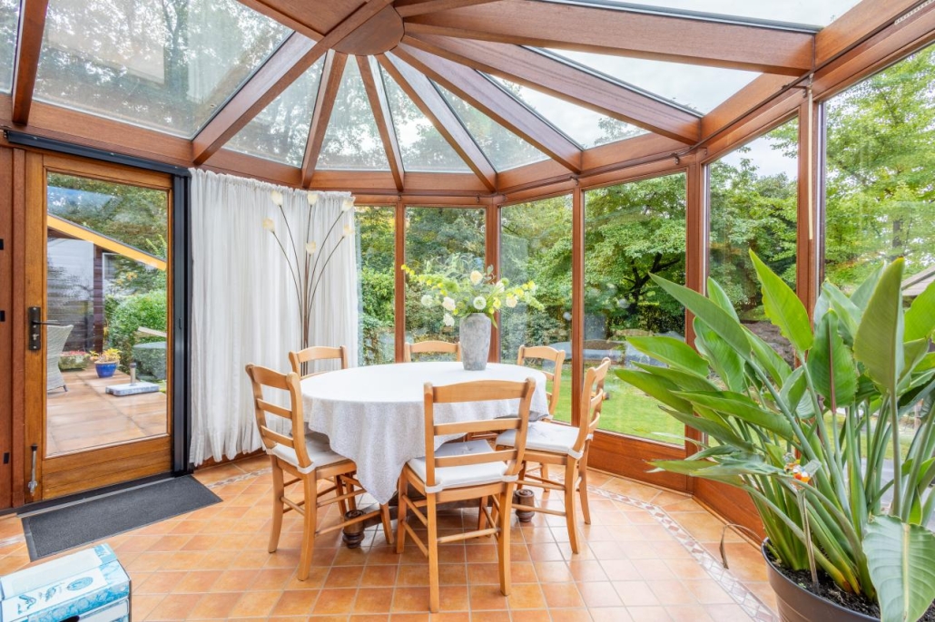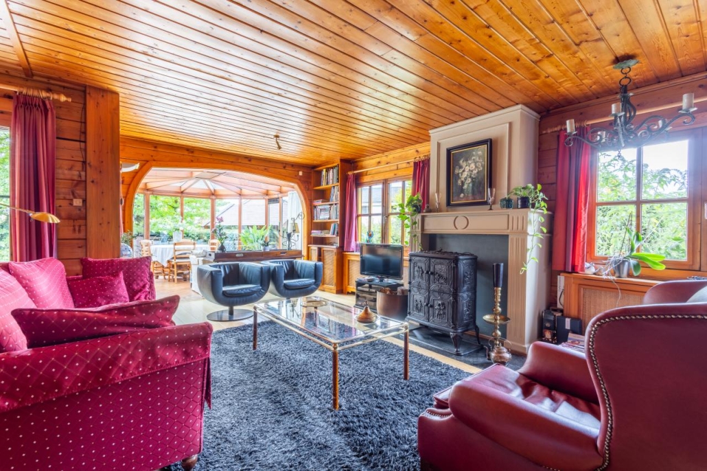 Ruime en lichte woonkamer met dubbelwandige houtkachel en aangrenzende serre.