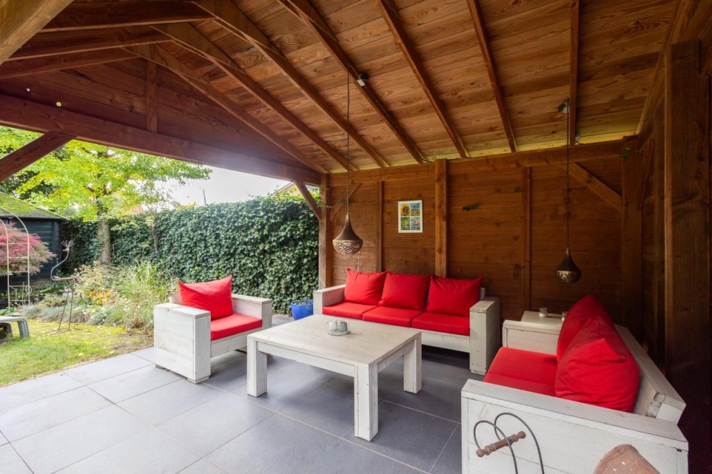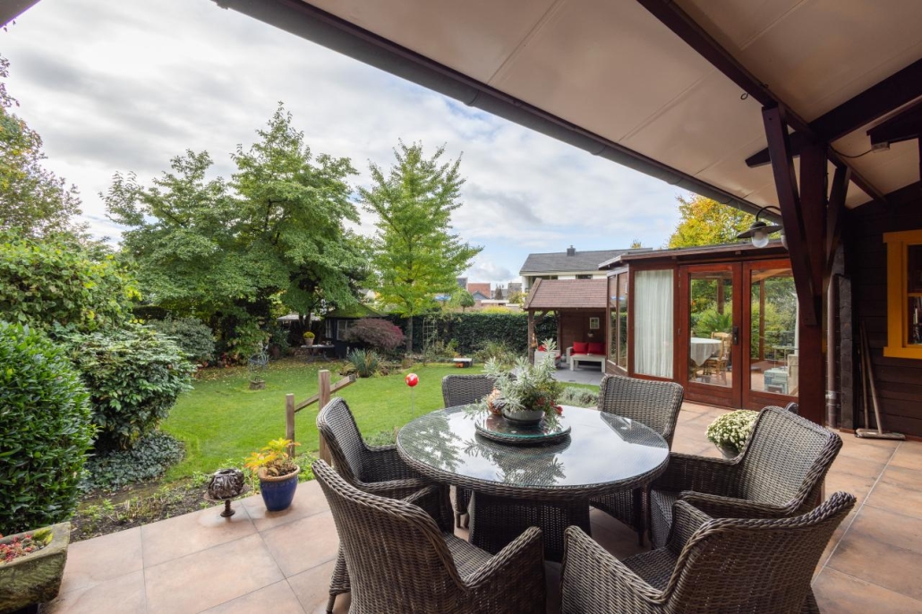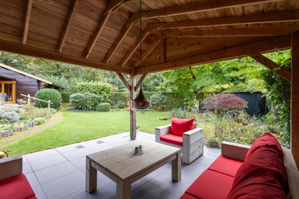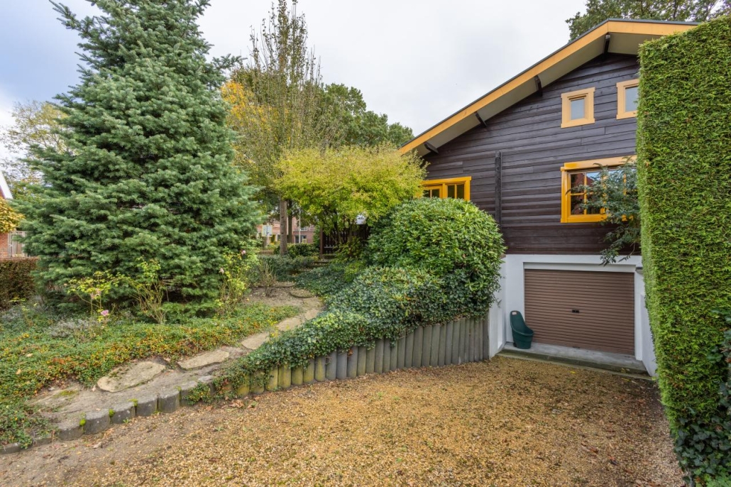Aan de ene zijde van de woning bevindt zich een royale oprit met ruimte voor meerdere auto's, aan de andere zijde een garage. De fraai aangelegde tuin rondom de woning biedt volop mogelijkheden om te genieten van zon én schaduw. Het terras met overkapping aan de woonkamerzijde is gelegen op het zuidwesten.
