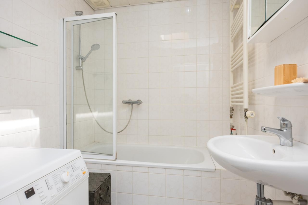 De overloop met tochtportaal en inbouwkast geeft toegang tot twee comfortabele slaapkamers, waarvan één met vaste kast. De lichte badkamer is uitgerust met een ligbad, wastafel en wasmachineaansluiting.