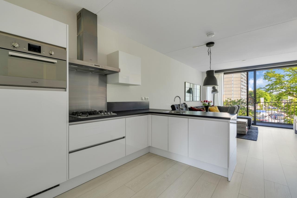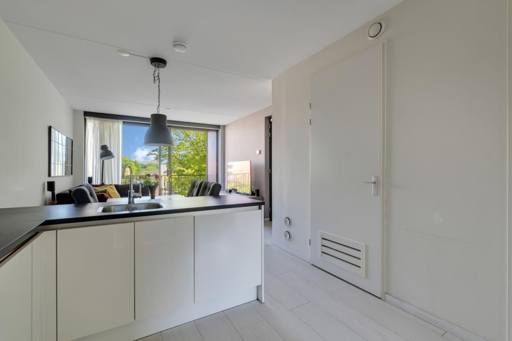 Via de centrale hal stap je binnen in de lichte woonkamer, waar grote raampartijen zorgen voor een fijne, natuurlijke lichtinval. De open keuken sluit hier naadloos op aan en is voorzien van moderne inbouwapparatuur. Vanuit de woonkamer heb je toegang tot het balkon, waar je op zonnige dagen heerlijk kunt ontspannen met een kop koffie of een goed boek.