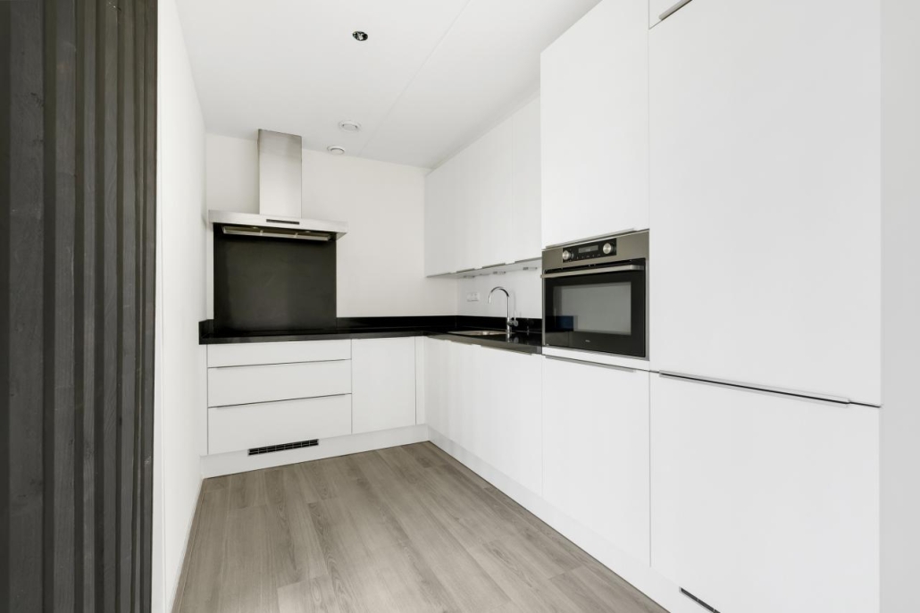 De open keuken is modern ingericht en voorzien van diverse inbouwapparatuur, waaronder een oven, vaatwasser, inductiekookplaat, afzuigkap en koel-vriescombinatie. Daarnaast is er een praktische bergruimte naast de keuken met plek voor witgoed en extra opslagruimte.