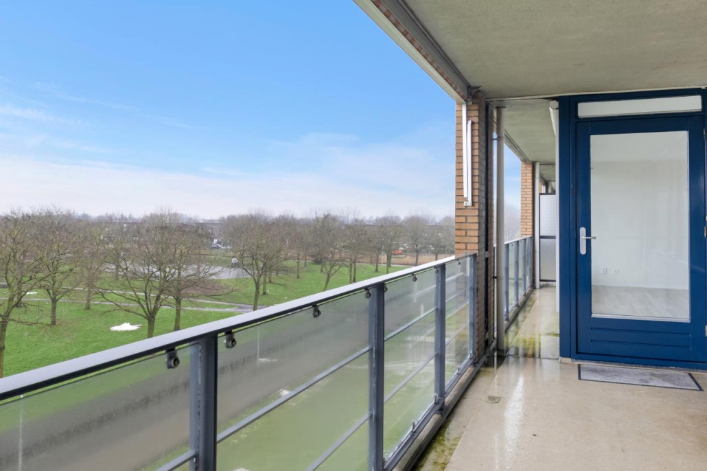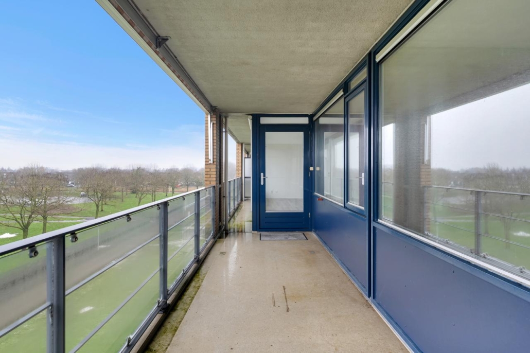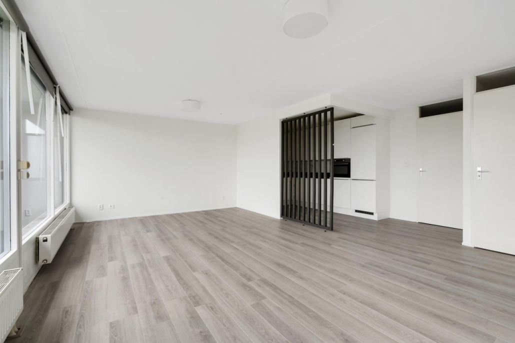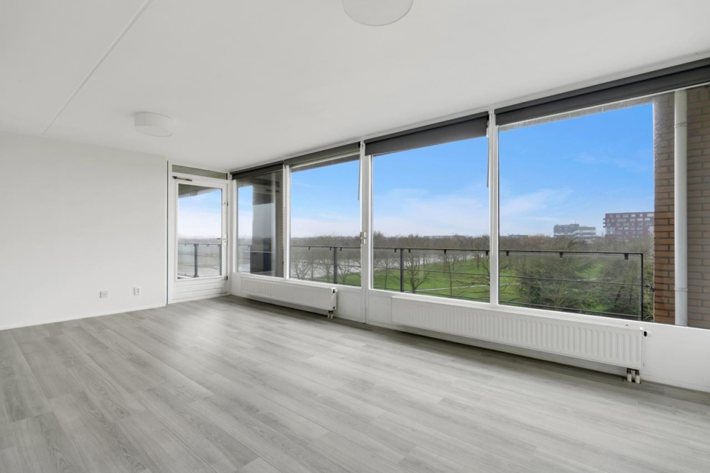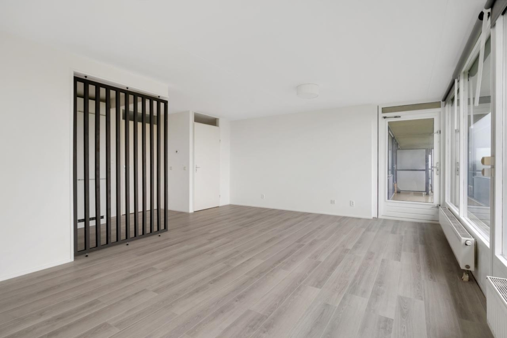 Bij binnenkomst van het appartement komt u in de hal, vanuit hier zijn alle vertrekken van het appartement toegankelijk. De ruime woonkamer biedt veel natuurlijk licht door de grote raampartijen. Vanuit de woonkamer heeft u toegang tot het ruime balkon, dat gelegen is op het westen. Dit maakt het de perfecte plek om te genieten van de middag- en avondzon.
